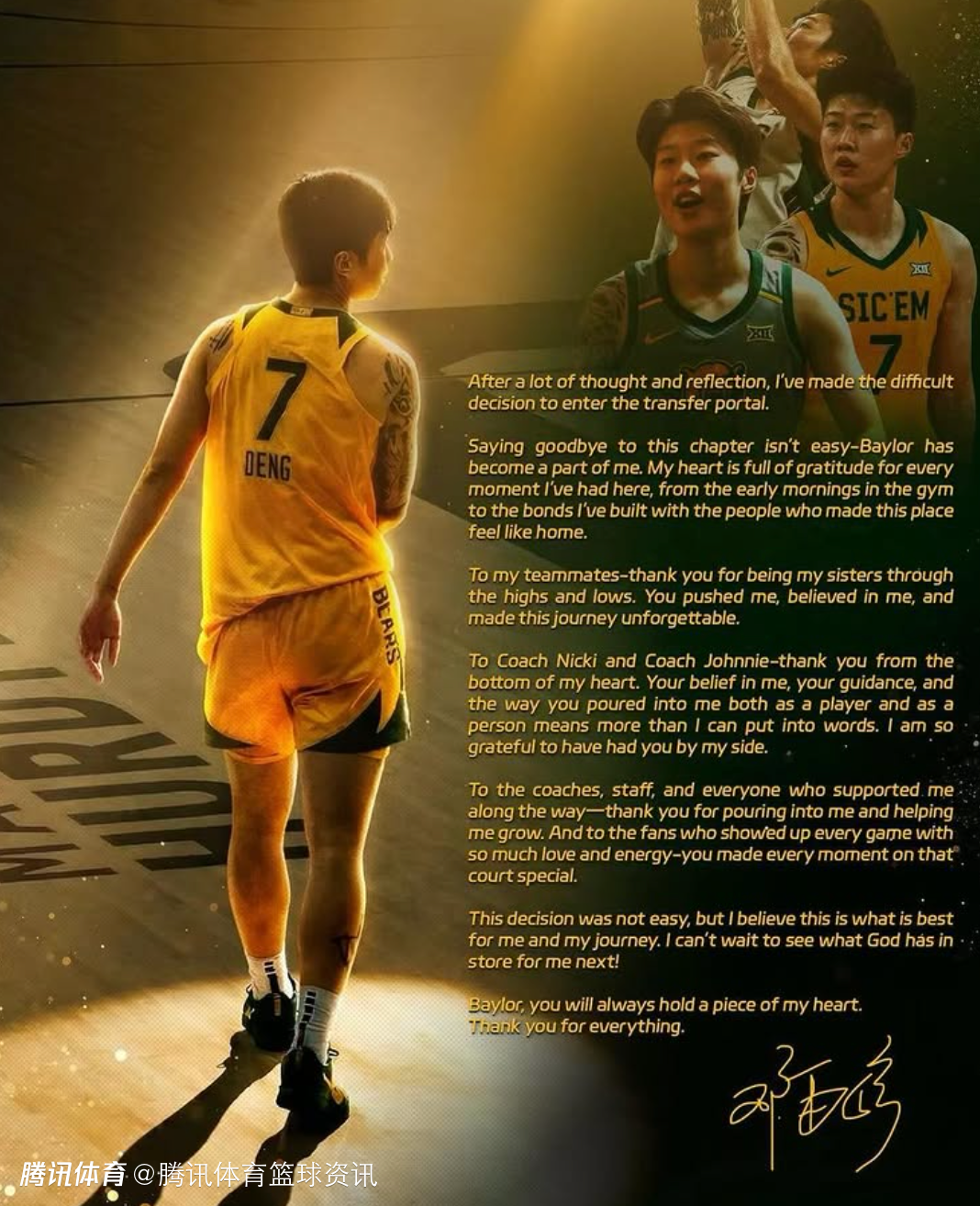 北京时间4月3日,邓雨婷社媒自宣将转校,离开贝勒大学。